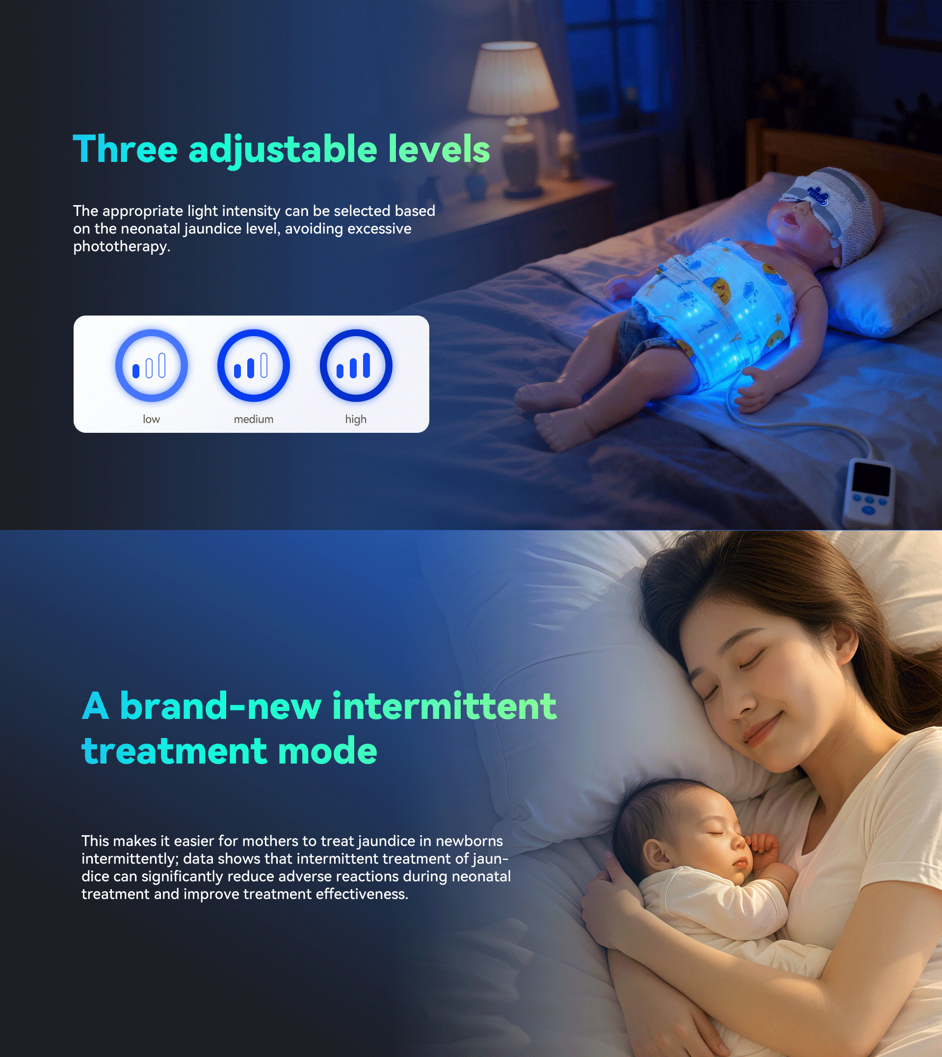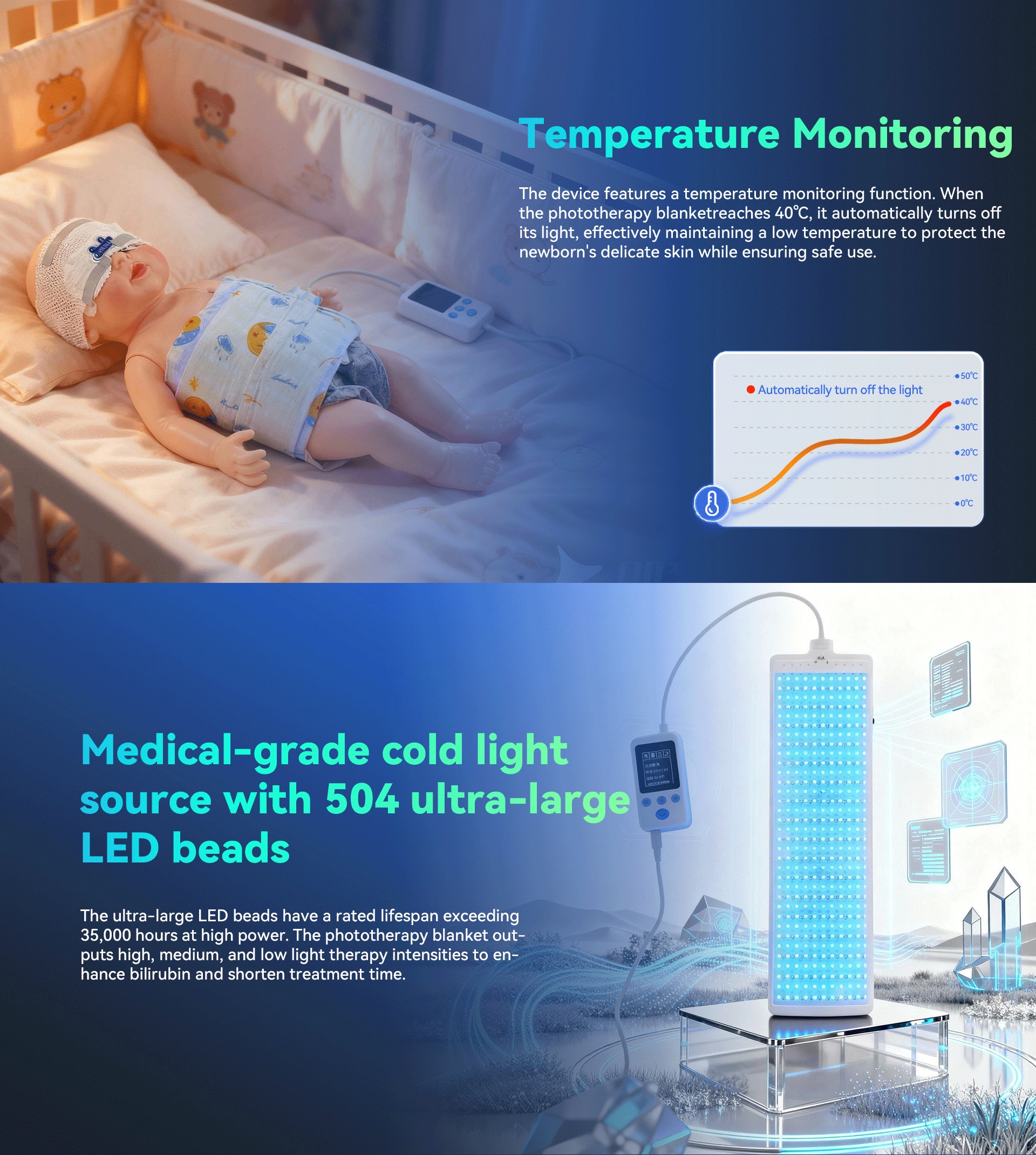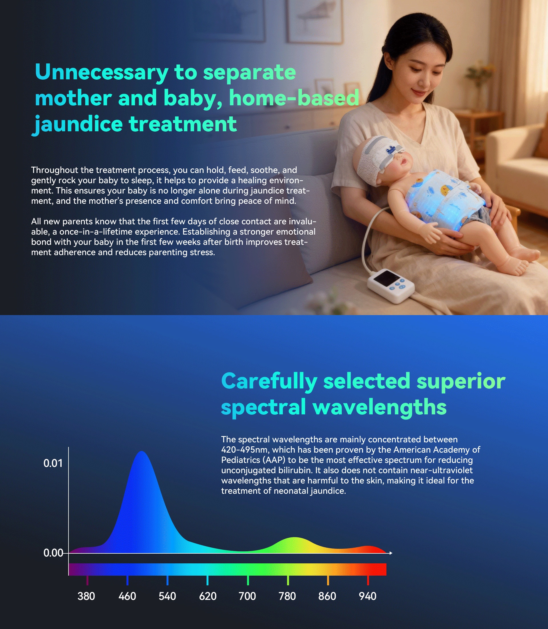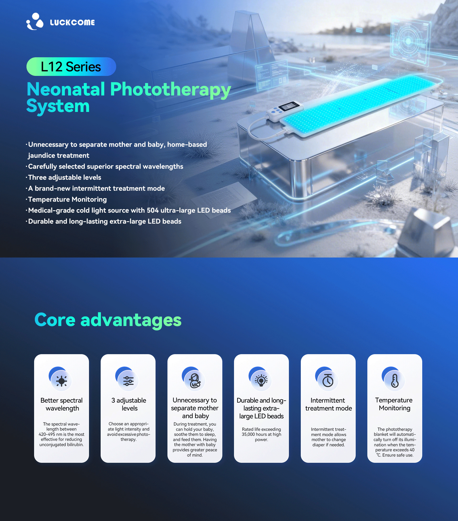 This product is a home-based neonatal jaundice phototherapy device, designed to enable safe and effective treatment at home and avoid unnecessary mother-baby separation. It utilizes carefully superior spectral wavelengths and features a large irradiation